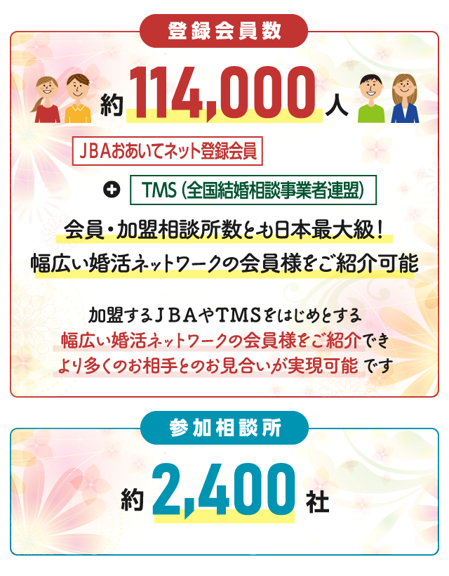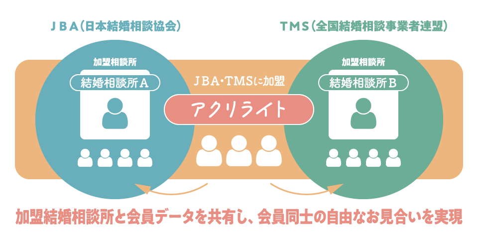 結婚相談所 アクリウェディング神戸元町では、日本結婚相談協会(JBA)、全国結婚相談事業者連盟(TMS)に加入し、「全国の結婚相談所約2,400社」の「約11万4,000人におよぶお相手情報」をお気軽にご参照いただけます。成婚をより身近なものとする効率的なシステムを、皆さまに提供しております。
